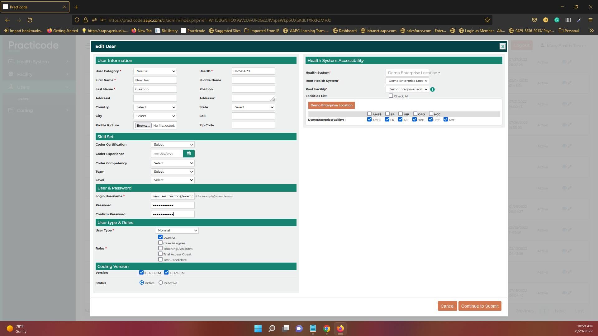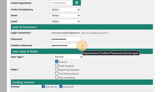 9. If the passwords do not match or do not meet the needed criteria, hover over the alert symbol to see what's wrong with the password.