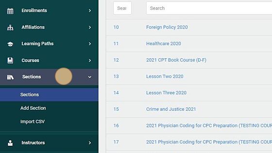 8. Sections - once you have created courses, you create sections to handle the enrollments. This tab also allows you to create them both manually and in bulk.