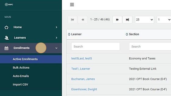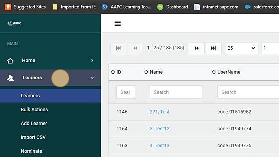 4. Click "Learners" menu header. This menu contains the Learners option, bulk actions for learners, add a learner, and import CSV to bulk import learners.